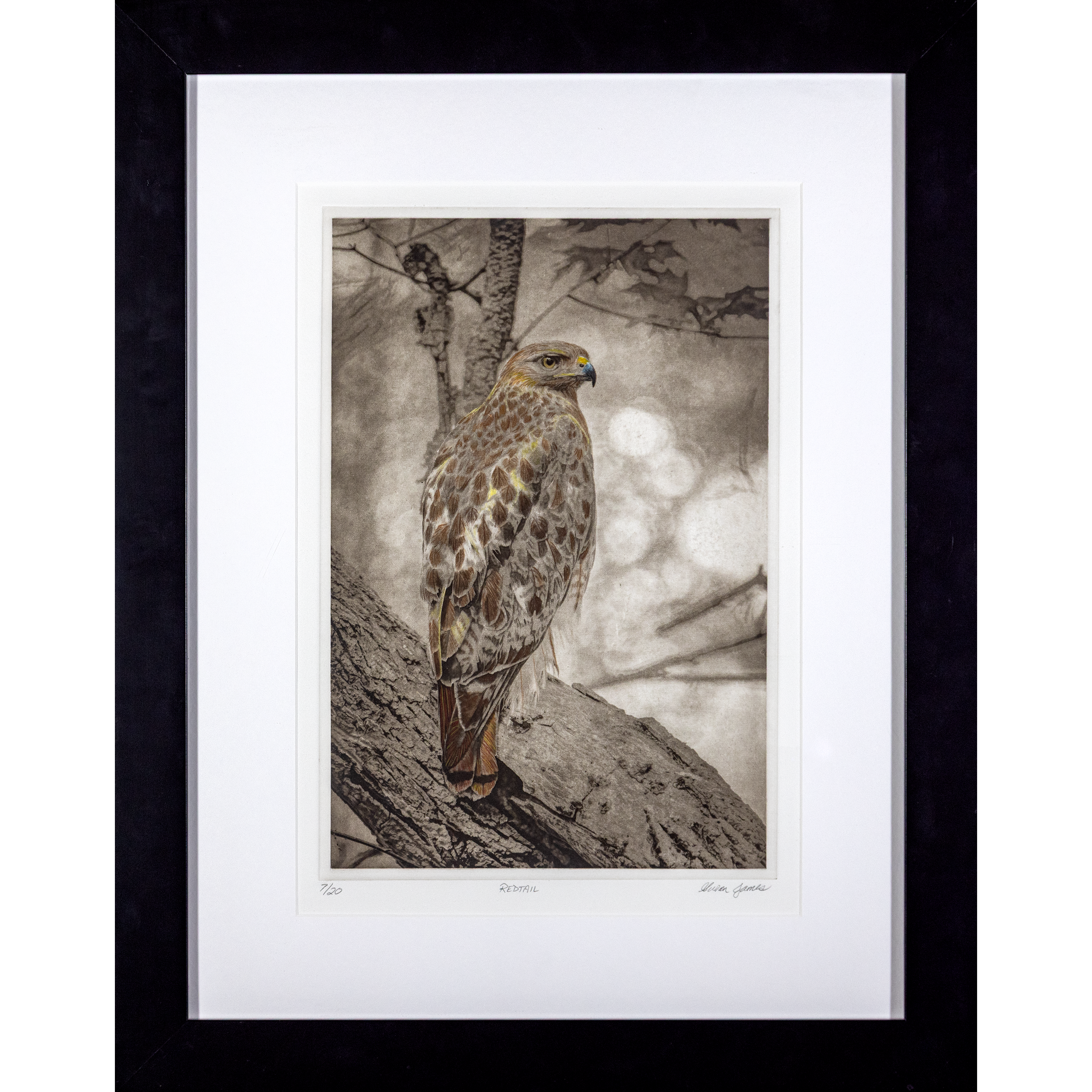 About This Piece: This limited edition print, one of only 20 plus two artist proofs, features a stately red-tailed hawk perched on a branch, its gaze directed off to the right. The original source photograph, taken by James herself during a sunrise walk at Radnor Lake State Park in Nashville, TN, is transformed into a rich, sepia-toned photogravure, providing an exquisite base of deep shadows and subtle midtones. Over this, the artist has meticulously applied aquarelle pencils, introducing vibrant yet naturalistic hues to the hawk's plumage, particularly highlighting the warm reds and browns that give the species its name. This hand-coloring technique breathes a unique vitality into each print, ensuring no two are exactly alike, and creating a powerful and intimate portrait of this iconic raptor within its natural habitat.
